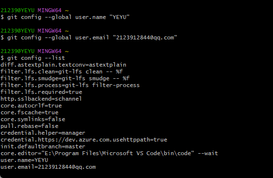 git config --global user.email "你的邮箱@example.com"如下图一样list中能看到配置的用户名和邮箱就代表配置成功了!
